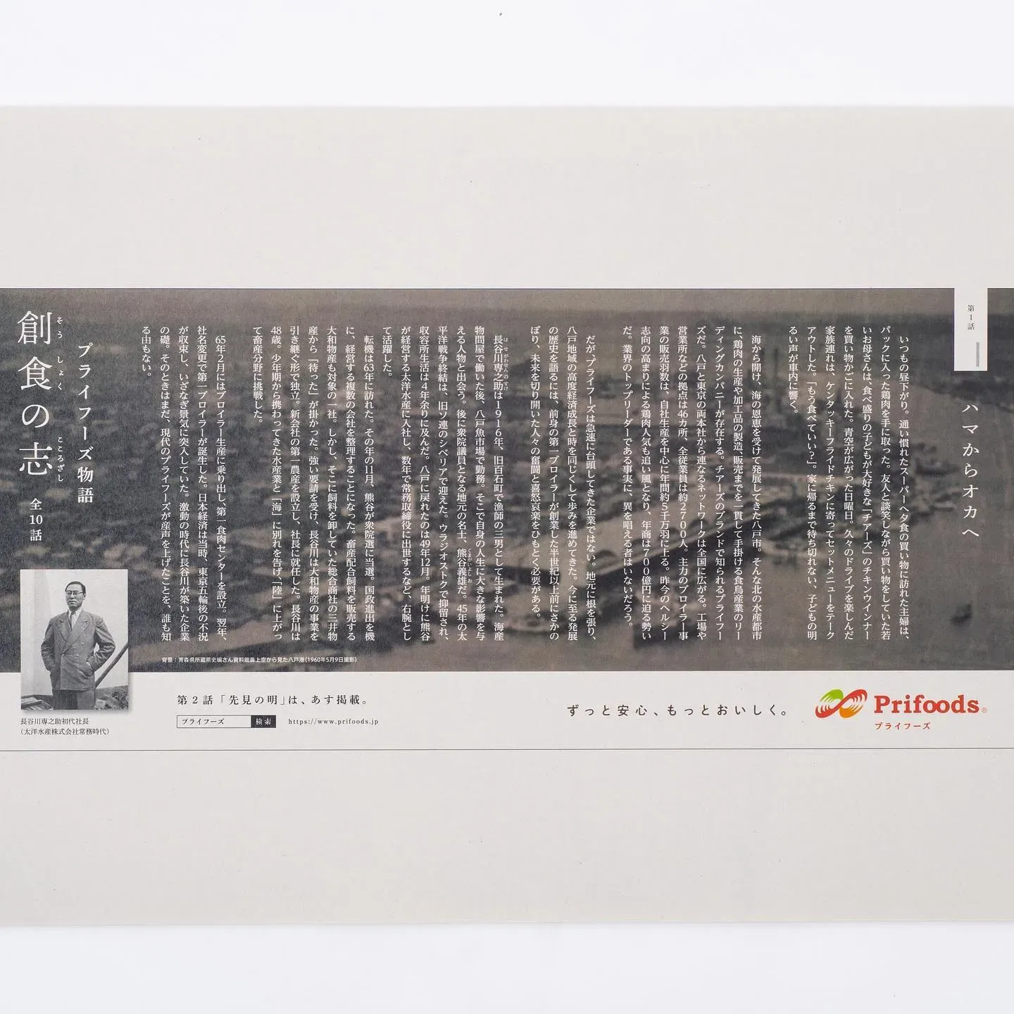 昨年、八戸新社屋落成を記念し、デーリー東北新聞朝刊に全10話の企業史小説を掲載しました。題名はプライフーズ物語「創食の志」。創業から現在に至るまでの歴史をエピソードや写真を交え、描いています。